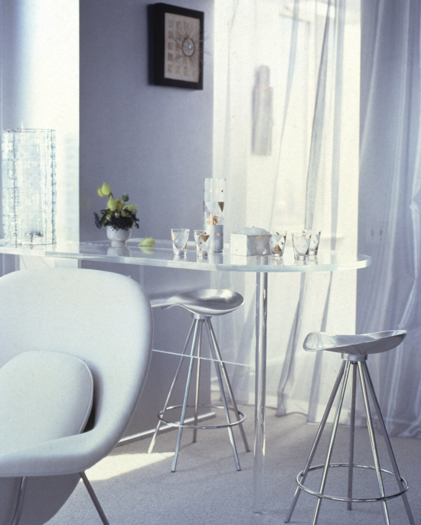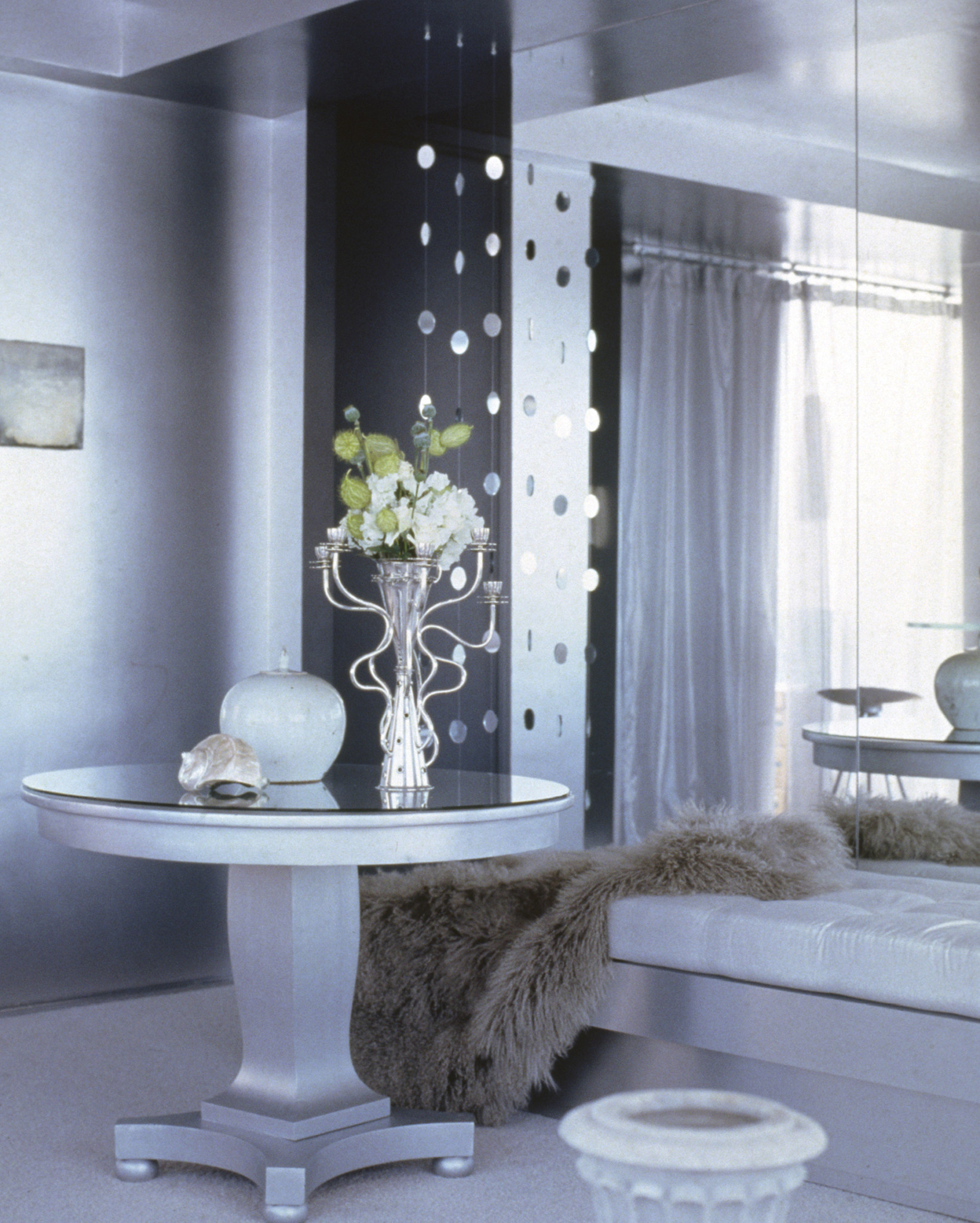 This apartment designed and executed for the celebration of the millennium made the cover of New York Magazine at the time because it exemplified what my views for interiors in this century would become: a collection of furniture and accessories from many periods all unified by a common color. I selected a highly reflective silver paint for the walls and ceiling, matching all the fabrics and textures. The result is what appears to be a “black and white” nostalgic set eliciting a calm and serene environment. The entire apartment changed colors throughout the day, sometimes turning orange at sunset, and depending on the accessories the interior reflects the different seasons.